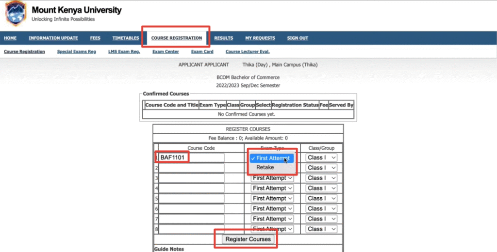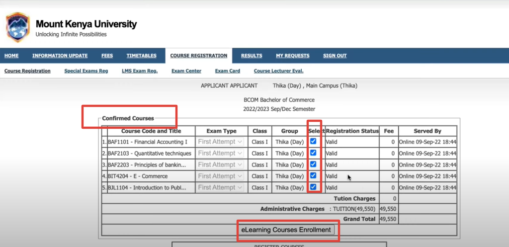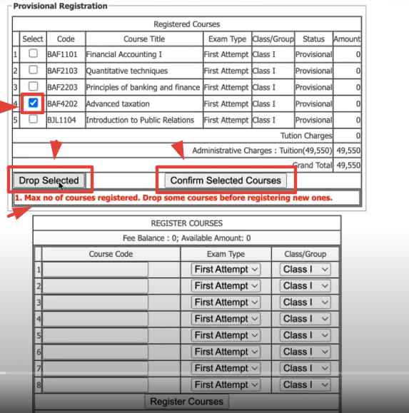 - After submission, check the “Confirmed Courses” section. If your courses appear here, your registration is successful.